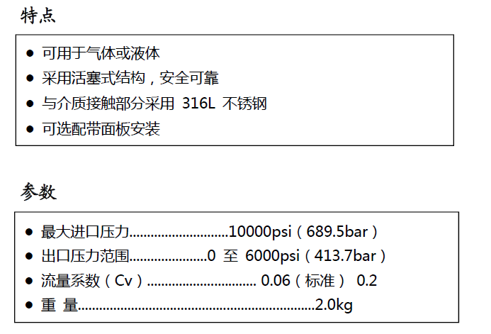 减压阀和背压阀是才用316L不锈钢材质制造,适合于液体和气体,进口压力中高压均可。使用寿命长,介质范围广。可用以石油,化工,电力,天然气,半导体等行业。