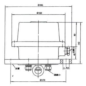 外形尺寸:浮球ψ88×172、接线盒 大外径ψ205、高142、安装法兰尺寸:螺栓孔中心圆直径ψ170,4孔-ψ18、法兰外径ψ205