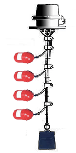 多点式电缆浮球开关,采用磁性开关电缆浮球组合(浮球为圆形,椭圆和长圆形)多点共用一个重锤,依靠悬索固定浮球位置,高温型采用不锈钢外壳和高温线缆,水银开关接点.