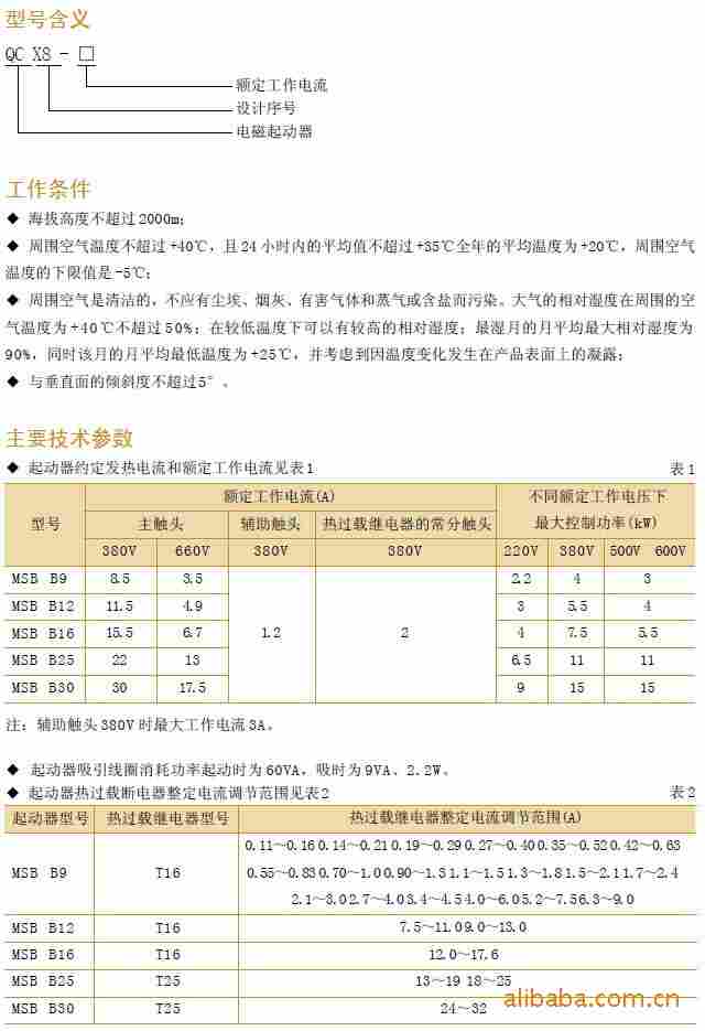 MSB(QCX8)系列磁力起动器适用于交流50Hz或60Hz,额定工作电压660V及以下,额定工作功率为15kW及以下的电路中,作为控制交流电动机启动,停止及过载保护之用。MSB(QCX8)系列磁力起动器有交流接触器、热过载继电器组成,装于具有一般防尘能力的金属防护外壳内,并有易于操作的按钮。热过载继电器具有温度补偿及自动与手动复位功能,可以板动调节钮进行电流整定。热过载继电器还带有断相保护机构,当电动机在断相运转时,能够切断电动机电源进行断相保护。
