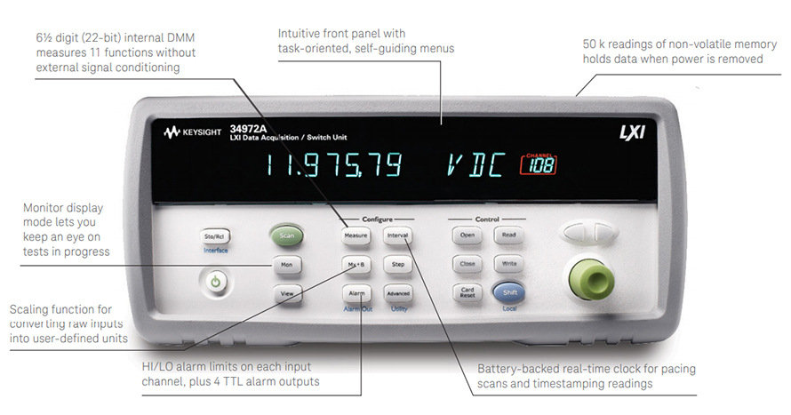 Keysight 34970A 数据采集/数据记录仪开关单元由一个 3 插槽主机和一个内置的 6 1/2 位数字万用表组成。每个通道可以单独配置,以测量 11 种不同功能,这样既不会增加成本,也不必使用复杂的信号调理附件。您可用 8 种可选插入模块建造紧凑的数据记录仪,全功能数据采集系统或低成本的开关单元。模块上的螺钉连接可不需要终端接线盒,的继电器维护功能记录每个开关的闭合次数,从而实现容易和可预期的继电器维护。*的 34901A 模块具有内置的热电偶参考和 20 个 2 线通道。