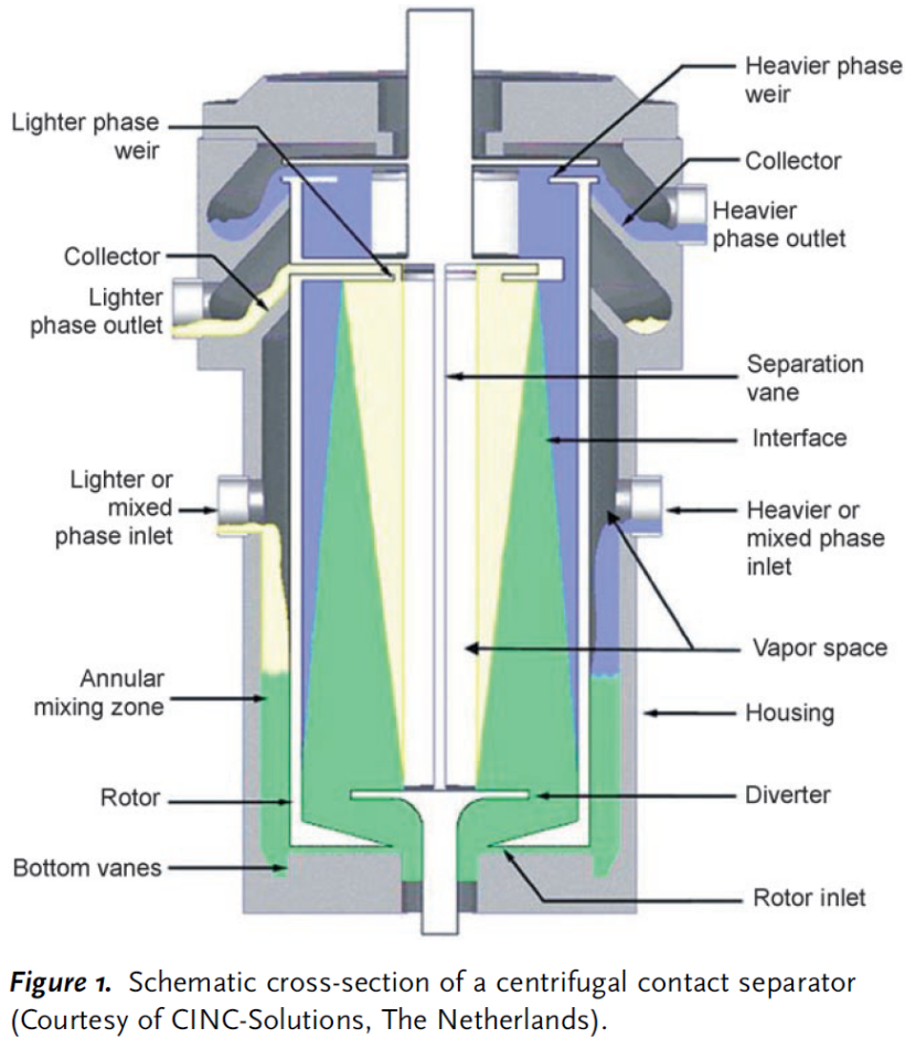 该装置是一种接触式连续离心萃取器(CCS),只有实验台规模大小,用于油水分离(如清理溢油)、连续萃取发酵产物(如青霉素和苯丙氨酸)以及在原子废物工业中用于提取和净化放射性废物。图1展示了CCS的结构示意图。