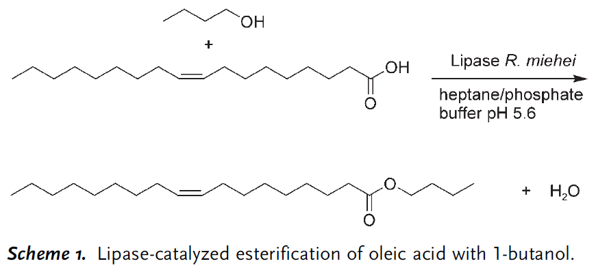 脂肪酶催化油酸和乙醇的反应已经为人所知,但作者发现用1-丁醇代替乙醇所得到的转化率要高得多。另外,作者还介绍了用青霉菌coryophilum的粗提取物在胶束体系中将丁醇和油酸酯化的方法。在间歇模式下,尽管存在大量过剩的水,这个反应仍然完全转化。据推测,该反应是由反应物的亲脂性引起的。在第1组系列实验中,使用了一种有机相,组成为庚烷中油酸(0.6 mol/L)和1-丁醇(0.9 mol/L)的混合物。
