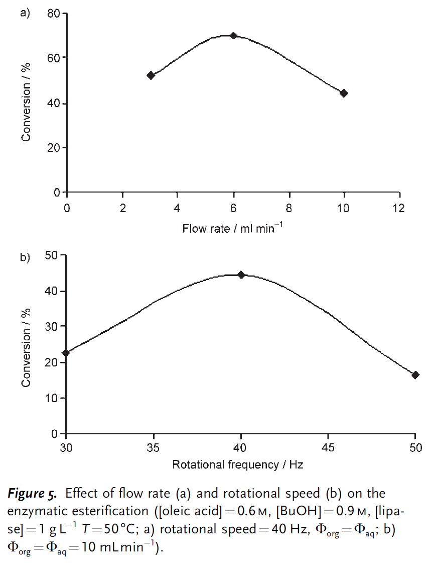 水相由在pH=5.6的磷酸盐缓冲液中的R. miehei脂肪酶(1 g/L)溶液组成。作者首先研究了两相流量和离心机转速对转化率的影响(图5)。在这些条件下,作者发现转速为40 Hz,两相流量均为6 mL/min时达到了*的稳态转化率(70%)。转化率显示了与每相流量相关的一个明显的*值。