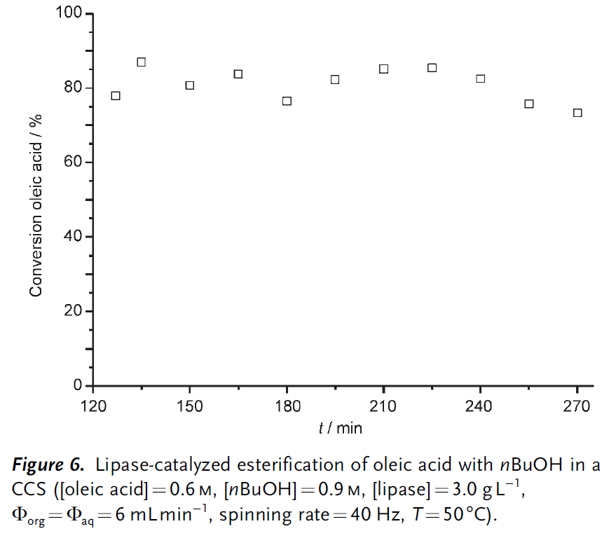 接下来,作者研究了用CCS进行酶催化转化的潜力。大多数酶在水环境中功能*,因此是在CCS中测试的理想催化剂。由于酶很容易受到剪切力的破坏,因此采用低混合底板的CCS。该底板与离心机周围的保护筒连接,从而避免了进入的液体与旋转离心机直接接触。以油酸和1-丁醇为模型反应,研究了Rhizomucor miehei脂肪酶催化油酸与1-丁醇的酯化反应(Scheme 1)。