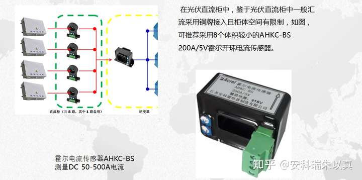 在光伏直流柜中,鉴于光伏直流柜中一般汇流采用铜牌接入且柜体空间有限制,如图,可采用8个体积较小的AHKC-BS 200A/5V霍尔开环电流传感器。