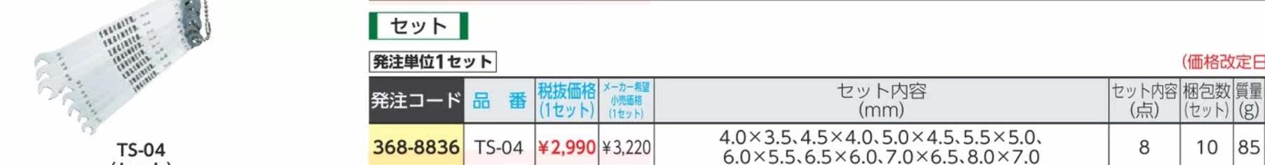 TS-04特长 工程师迷你扳手套装 厚度只有1.5mm的薄型扳手套装。 眼镜、扳手的组合套装。 头部的拐角度是30°。 用途 用于六角螺栓、螺母的安装和拆卸。 商品规格 设置内容(点):8 设置内容(mm):4.0×3.5、4.5×4.0、5.0×4.5、5.5×5.0、6.0×5.5、6.5×6.0、7.0×6.5、8.0×7.0 设置内容(点):8 材质 不锈钢 质量单位 85g