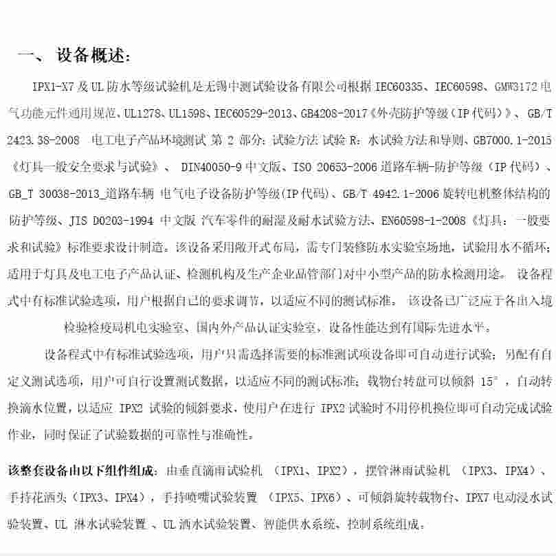 我们主营产品:IPX1、IPX2、IPX3、IPX4(IPX4K)、IPX5、IPX6(IPX6K)、IPX7、IPX8、IPX9K等防水试验设备,IP5K、IP6K等防尘试验箱、军标砂尘箱、军标盐雾箱、军标淋雨箱、汽车整车方舱淋雨喷淋试验房、等IP防护等级试验设备,盐雾试验箱、复合式盐雾试验箱,高低温试验箱,恒温恒湿试验箱,高低温冲击交变试验箱,快速温度变化试验箱,高温恒温试验箱,烤箱,紫外灯耐气候试验箱,灯具类检测设备、燃烧类仪器、电线插头开关类试验设备、家电类及通用安规类仪器、电梯零部件类检测设备、消防器材类检测设备、电信光纤光缆类行业。