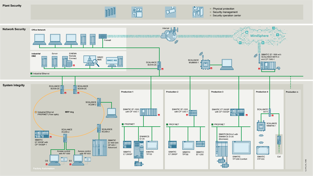 单元保护概念可以根据需要实施,并使用西门子的“集成安全功能”网络组件进行通信保护,例如工业安全设备 SCALANCE S、用于有线和无线网络 (4G/5G) 的 SCALANCE M 工业路由器和 SIMATIC 安全通信处理器。