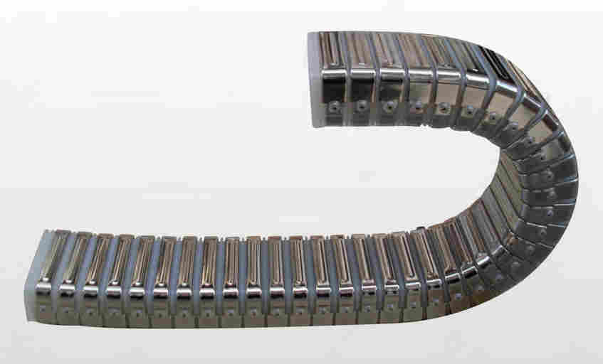 钢制拖链的主体是由链扳(采用钢板经淬火后再抛光镀铬/镀锌/喷塑处理)、支撑扳(挤拉铝合金)、轴销(合金钢)等部件组成,使电缆或橡胶管与拖链之间不产生相对运动,不产生扭曲变形,链扳经镀铬处理外形效果新颖结构合理,灵巧强度高,钢性好不变形,安装方便,使用可靠,易拆装,尤其是采用度耐磨材料,合金铜为轴销,提高了产品的耐磨强度,弯曲更灵活,阻力更小,降低了噪音,从而可保证长时间使用不变形