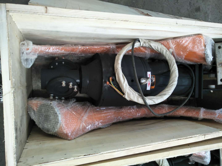 低速潜水推水器采用两级斜齿轮减速箱减速机构,减速箱前部设置密封油腔,叶轮轴贯穿该油腔,出油腔部位用机械密封进行密封。叶轮和叶轮轴之间采用键连接固定在轴的端部,并加以密封,叶轮和叶轮轴必须采用锁定装置以防叶轮和轴无论是正转还是偶尔发生反转都不会发生松动,电机轴与污水接触部分(叶轮与机械密封之间)带轴套防护或其他有效防护措施,防止电化学腐蚀现象发生。减速箱轴承设计寿命不低于l00000小时。