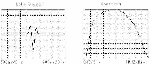| 测试条件 发射电压:100v 脉冲宽度:200ns 重复频率:200Hz 增益:-16dB 试块:10mm PS | 测试结果 -20dB回波脉冲宽度(T10):314.8ns 中心频率(f0):4.62MHz -6dB相对带宽(B-6):116.5% 相对回波灵敏度(Srel):-35.6dB |