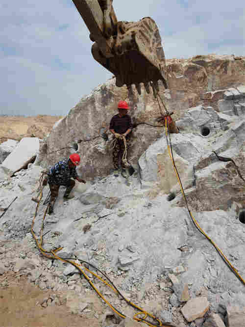 岩石劈裂棒的钻孔直径有13厘米到15厘米多款,钻孔间距2到3米一排,钻孔的深度在2米左右,每次放入一排4到6条分裂棒,大型分裂棒需采用挖机吊装放入孔中,岩石从底部开始向上裂开,液压泵站在一两分钟产生5千到1万吨的分裂力,一次就可胀裂开石头几十个立方,每天可轻松破碎坚硬岩石上千立方,强大到即使没有凌空面也能达到大间距、大裂缝的施工效果如详细了解点击头像与我联系 公路加宽破石头劈裂机一个班能做吨压劈裂棒的优点盈利计算柱塞式劈裂棒破拆法的经济消耗为电费、人工工资、机械耗损费;破碎锤作业基本上都是选取租赁机械带操作人员的,其经济消耗为租赁费、人工工资费、机械耗损费等。