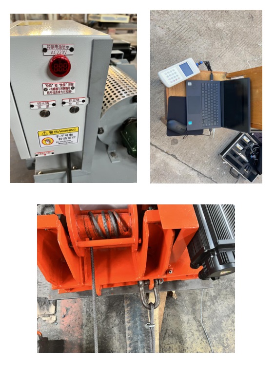 该试验机是卷扬机 伺服电机结构,试 验机与电杆稍部之 间为拉伸空间,试验空间通过伺服电机驱动减速机和卷扬机旋转带动下钢丝绳卷动来自动调整。计算机控制软件自动读取无线主机参数,可以设定弯矩,自动读取扰度, A/B点,自动按步骤检测电杆弯矩,测试计算出扰度值。