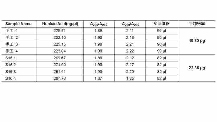 实验结果:TGuide S16全自动核酸提取纯化仪配套DP661提取的血液RNA 得率好,纯度高,并且能满足高通量测序需求。