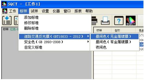 针对国内交通路标使用较多的标准GB2893,SQCT软件将该标准中的标准色域纳入其中,客户只需根据自己需要进行选择即可,方法同菜单“道路交通反光膜GB/T18833”。