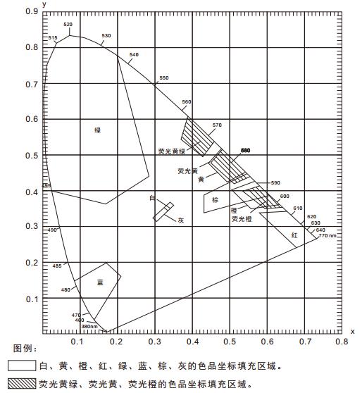 在《GB 2893安全色》、《GB/T 18833道路交通反光膜》等相关标准中,通常给出一块颜色区域(多个色品坐标点)和亮度因数要求,在D65/A光源和45/0几何条件下,判定样品是否落在对应的颜色区域内,借此判定样品是否满足标准规定的色度要求。由于颜色区域为多边形,如下图所示,导致使用普通的分光测色仪无法完成判定。NS808测色仪配合SQCT软件的交通路标测量模块则可以轻松解决这方面的问题。