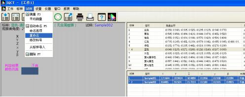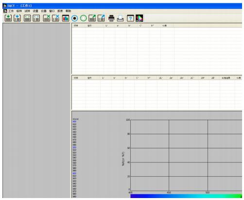 NS808的交通路标测试模块主要是通过上位机软件SQCT配合NS808仪器实现的。使用前需先安装好SQCT上位机软件,再连接NS808仪器,然后打开上位机软件,默认为普通测试界面,如图1所示,在该界面下可以完成CIE L*a*b、XYZ、ΔE*ab、ΔE*cmc、ΔE*00等色度数据的测试,详细菜单和工具栏的介绍请参照该软件自带“色彩管理控制软件使用说明书”,这里重点介绍交通路标测试模块。