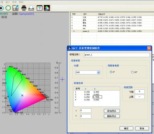 如图7所示,修改上面建立的名称为“green”的多边形-容差标样,先选中该标准,然后可以修改“标准名称”“光源”“标准观察者角度”“亮度因数“色品坐标”,修改完毕,点击“确定”按钮,则修改生效。