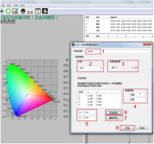 如图5所示,在位置1处输入标样名称,位置2处选择光源种类(默认为D65),位置3处选择观察者角度(默认为2度),位置4处输入亮度因数(除荧光物质外,普通反射样品亮度因数大于0小于1,即0<β<1)。在位置5处输入色品坐标点,然后点击“添加顶点”按钮,则新输入的色品坐标点出现在标准色域框内,重复上述步骤,依次输入各色品坐标点;对于输入错误的色品坐标点,先在标准色域框内选中,然后点击“删除顶点”按钮,则删掉该顶点。全部输入完毕,点击位置8处“添加”按钮,则完成“多边形-容差标样”建立。