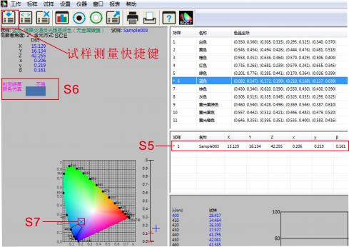 将测试样品放在NS808测量口径上,贴紧,鼠标点击试样测试快捷工具,如图13所示。大约1.5秒时间,完成测试,测试数据如图13中S5所示,在色品坐图中的位置如S7所示,仿真及判定结果如S6部分所示。