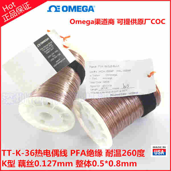 ANSI色标:正极,黄色;负极,红色;外部护套:透明PFA,OMEGA Engineering不使用重复加工的(回收再利用的)PFA或PVC生产热电偶线。