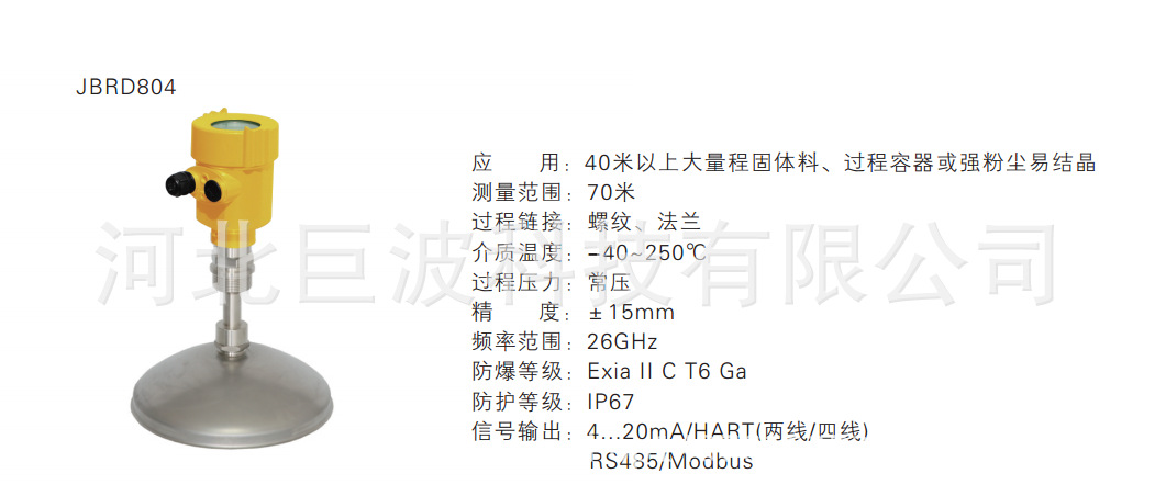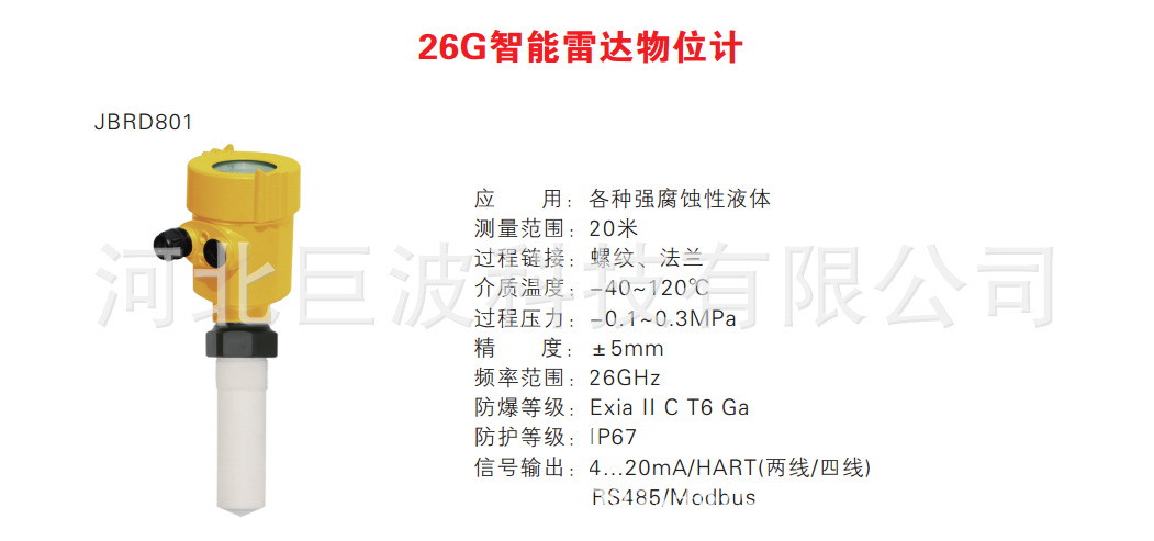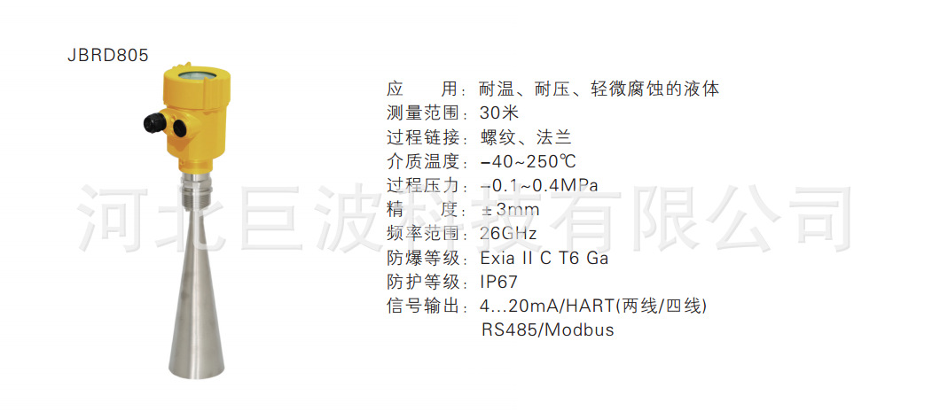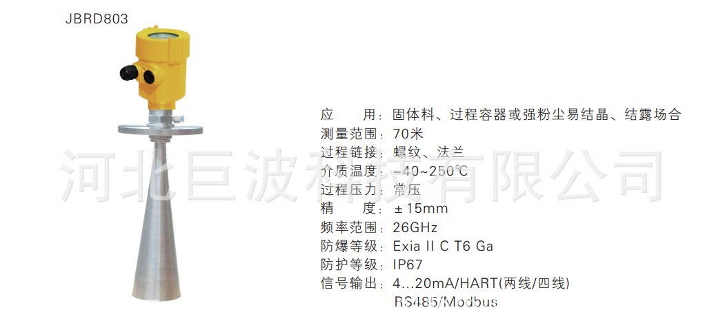 河北巨波科技有限公司是一家从事仪表研制、开发、设计、生产的国内新兴自动化企业,公司拥有雄厚的技术力量、的生产设备、完善的检测仪器及配套设施。目前采用国际技术,结合市场需求,相继开发出雷达物位计、超声波物位计等系列产品,产品性能已达到或接近国际水平。公司产品广泛服务于石油、化工、冶金、纺织、机械、供热、供电、供水、科研及环境工程等众多企业,为众多生产型企业和教育科研单位提供的计量产品和的售后服务。公司自成立以来一直秉承"诚实守信、精益求精、服务、客户至上”的理念,坚持以人为本,以管理为保证的经营模式,争创产品、技术、服务、企业。