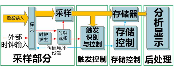 数据捕获部分包括信号输入、比较采样、触发控制、数据存储和时钟电路等。外部被测信号通过探头送到信号输入电路,在比较器中与设定的门限电压进行比较,大于门限电压值的信号为高电平,反之为低电平。采样电路在采样时钟(外时钟或内时钟)控制下对信号进行采样,并将数据流送到触发模块中,产生触发信号。数据存储电路在触发信号的作用下进行相应的数据存储控制。数据捕获完成后,由分析显示电路将存储的数据处理之后以适当方式显示出来。