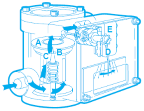 加有弹簧的活塞A的中心处有一个圆形开孔B,由于液体的推动,活塞A将沿着精密锥形轴C的轴线方向移动,中心圆孔B与锥形轴C之间形成一个可变面积的孔板,孔的面积与流量大小成正比,终达到平衡位置,活塞A通过机械接触带动读数指针D转动,当液体压力作用在活塞大面积上,产生一个很大的推力驱使读数装置E动作。当流量达到上限值时,压力降平均是3PSI。