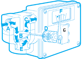液体进入A,在半圆形叶片B的周围通过,从出口C流出。叶片由于安装了弹簧D,使它对液体的流动产生阻力。叶片受到的推力越大,叶片摆动越大,通路E就开得越大。这样就能尽量减小在叶片上的压力降。叶片轴的转动带动指针F和像开关G这样的远程信号发送设备。轴也能够驱动微动开关凸轮和转换器,为远方电子显示设备提供信号。