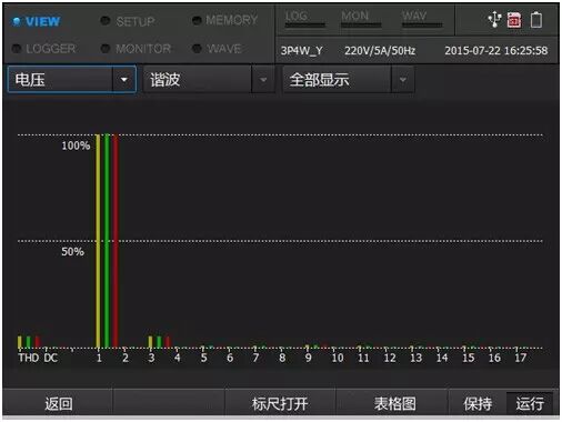 逆变器在将直流转换成交流输出之后,交流的电能质量是检测逆变器的一个很重要的指标。输出端的交流如果存在电能质量问题,不仅仅是影响逆变器使用效率,减少逆变器使用寿命,更有可能给使用者带来生命财产的安全隐患。例如,由逆变器输出的交流电往往含有谐波,下图为E6500对交流的谐波检测。