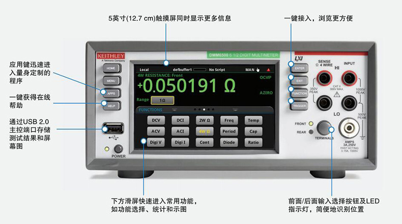 泰克DMM6500万用表由深圳市新博恩电子仪器有限公司现货销售泰克DMM6500万用表,DMM6500 是一种现代化台式 / 系统 DMM,提供了更多的测量功能、同类*的测量能力,而且价格就不会出您的预算。特点是 5 英寸 (12.7 cm) 容性大触摸屏显示器,可以使用手势体感,简便地观察、互动及浏览测量数据。除显示技术外,DMM 6500 杰出的模拟测量性能提供了杰出的准确度,一年期基本 DCV 准确度为 25PPM,两年期基本 DCV 准确度为 30 PPM,可望延长您的校准周期。