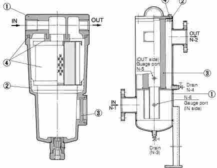压缩空气从IN口进入,经过AFF主管路过滤器滤芯过滤后分离掉其中的油、水和固态污染物(分离出来的这些杂志流入过滤器的下部,由自动排水器排出),出口便得到较为干净的气体。