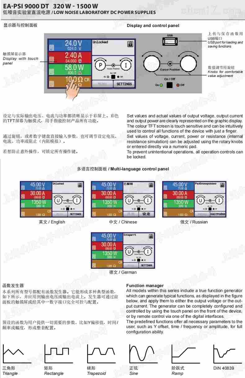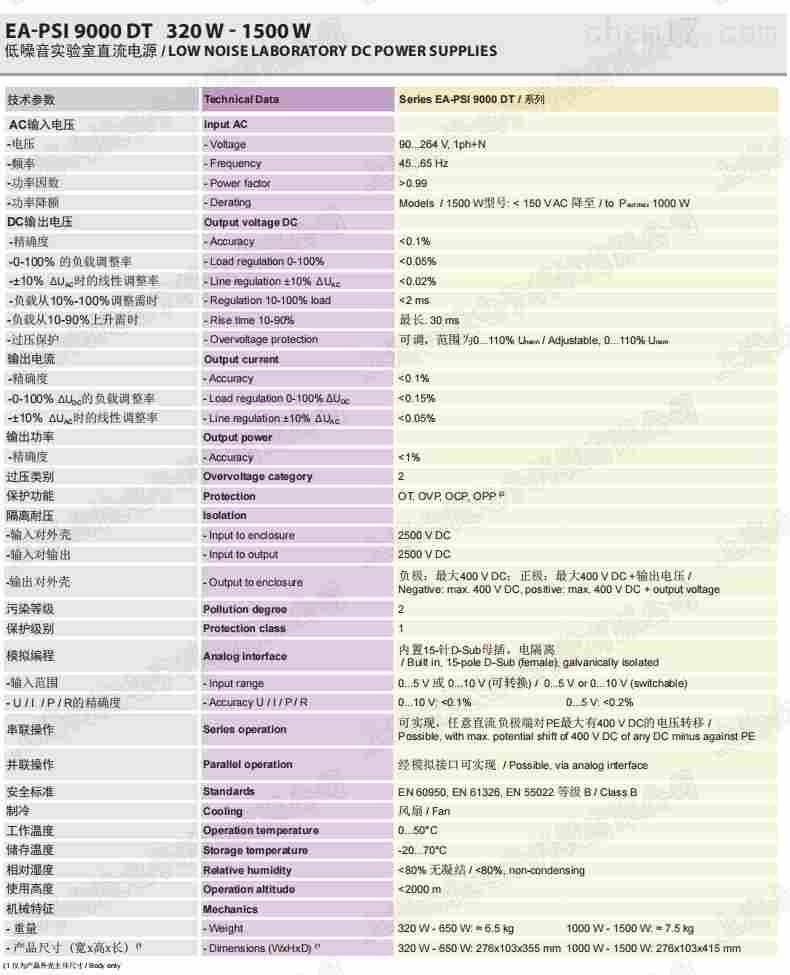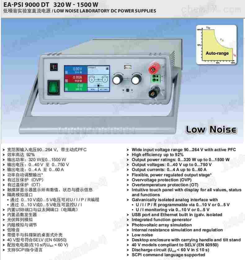 EA-PSI 9000 DT 系列是一款由微处理器控制的实验室电源,为用户提供友好、交互式操作理念,配有一系列标准功能。输