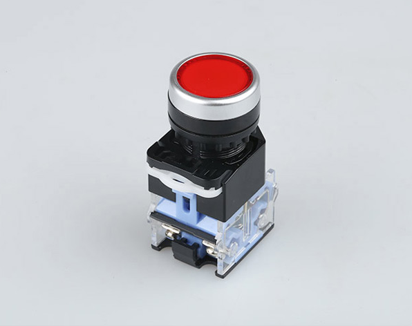浙江巨霸电气按钮开关是一种按下即动作,释放即复位的用来接通和分断小电流电路的电器。一般用于交直流电压440V以下,电流小于5A的控制电路中,一般不直接操纵主电路,也可以用于互联电路中。在实际的使用中,为了防止误操作,通常在按钮上做出不同的标记或涂以不同的颜色加以区分,其颜色有红、黄、蓝、白、黑、绿等。一般红色表示“停止”或“危险”情况下的操作;绿色表示“启动”或“接通”。急停按钮必须用红色蘑菇头按钮。按钮必须有金属的防护挡圈,且挡圈要高于按钮帽防止意外触动按钮而产生误动作。安装按钮的按钮板和按钮盒的材料必须是金属的并与机械的接地母线相连。
