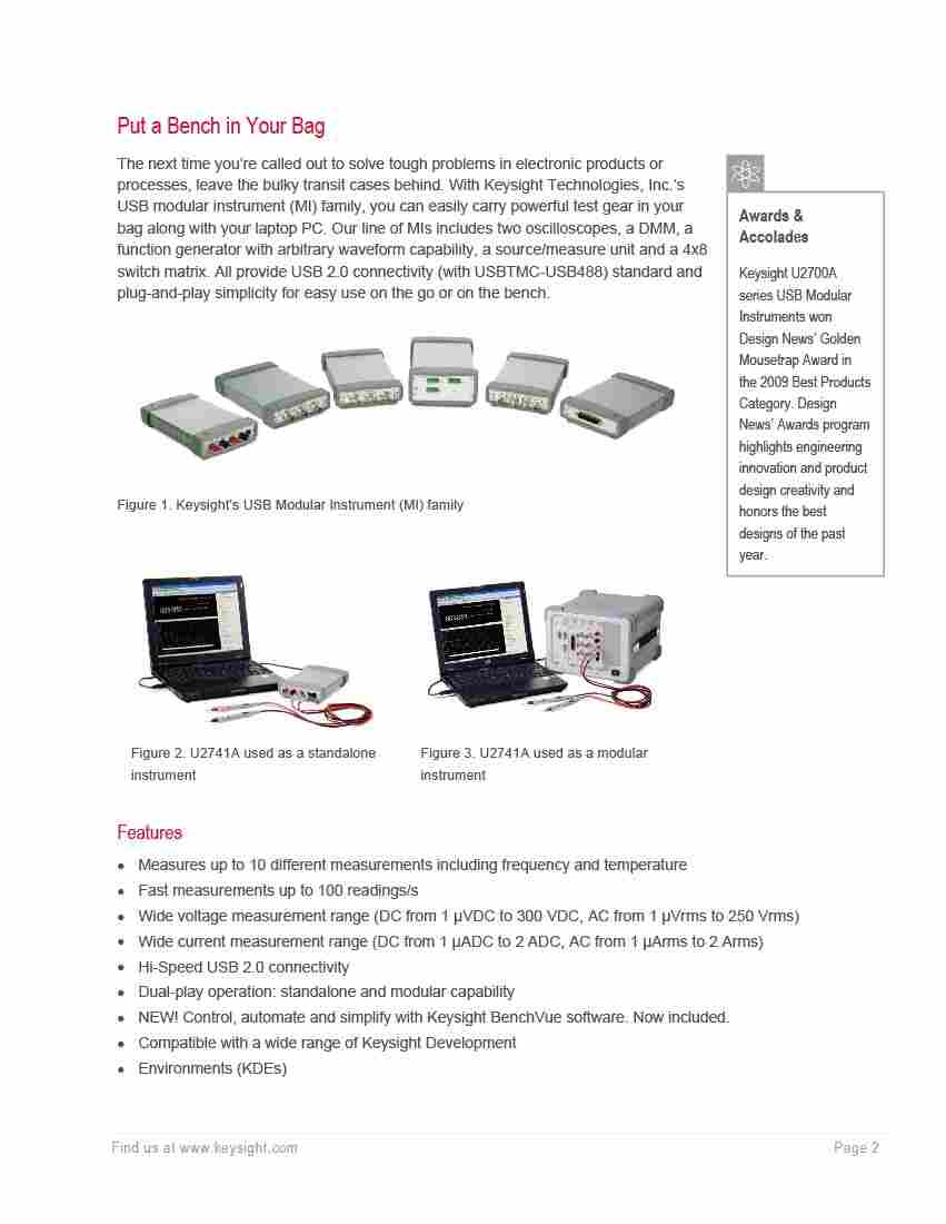 Keysight U2741A USB 万用表可以单独使用,也可以安装到 U2781A 模块化产品机箱中作为模块使用。 这款笔记本大小的 USB 数字万用表(DMM)可以与您的笔记本电脑一起放到电脑包中,这样您就可以随身携带一个功能强大的测试仪表。
