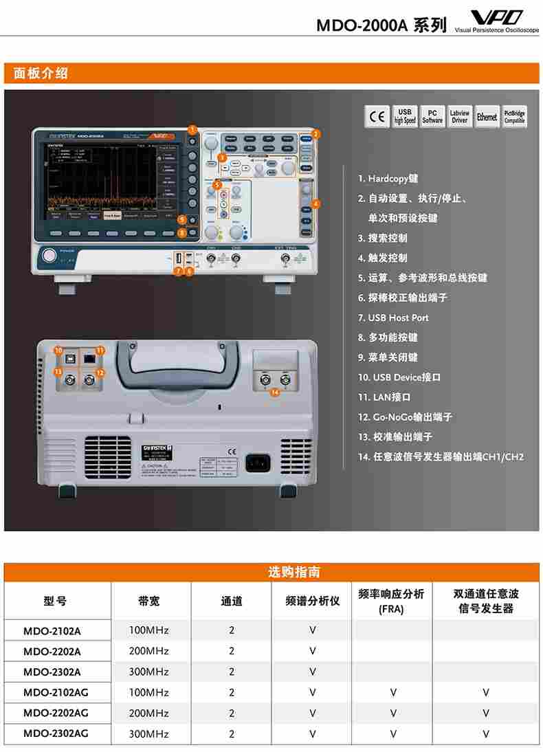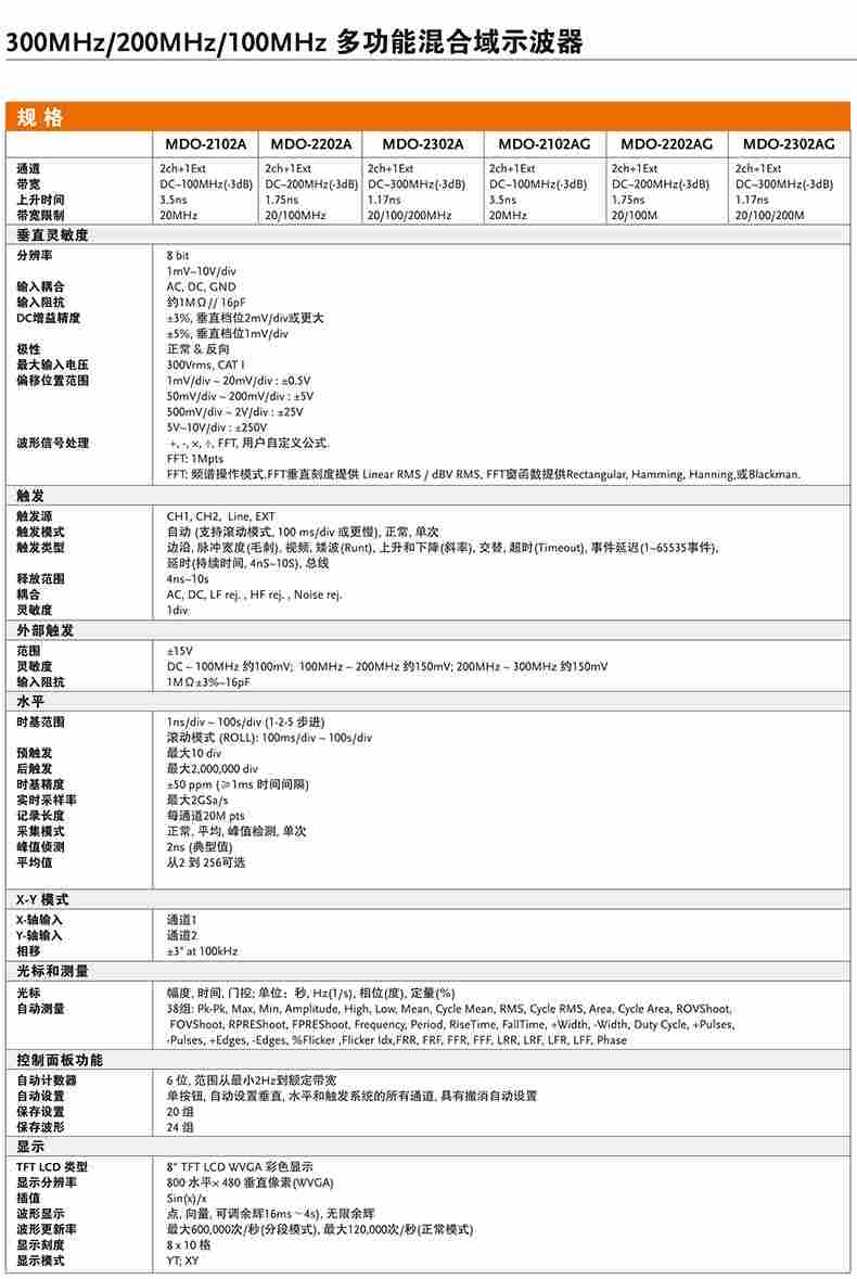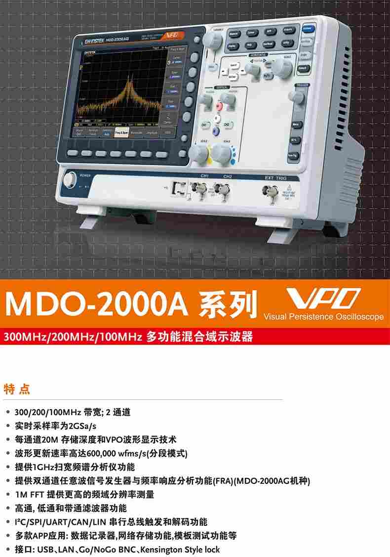 MDO-2000A系列是一款多功能混合域数字示波器。全机种带宽范围包括300MHz,200MHz和100MHz。实时采样率2GSa / s,储存深度20M /每通道。 该系列包括MDO-2000A和MDO-2000AG两个机种,全系标配频谱分析仪的功能。重要的是,MDO-2000AG具有一个双信道25MHz任意波信号发生器,并提供频率响应分析(FRA)功能。