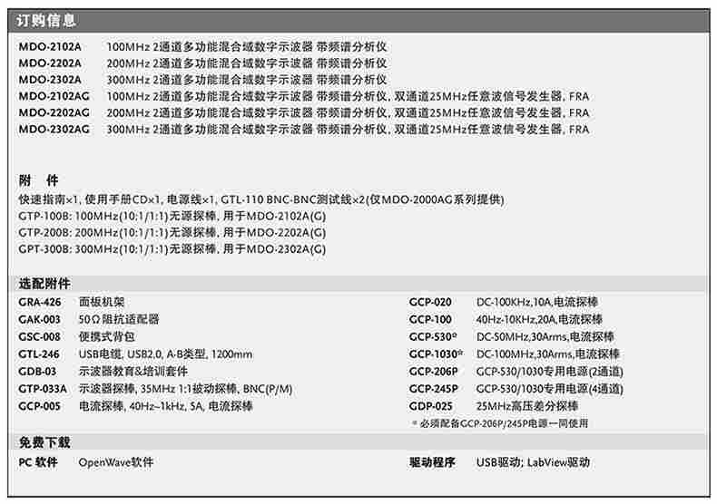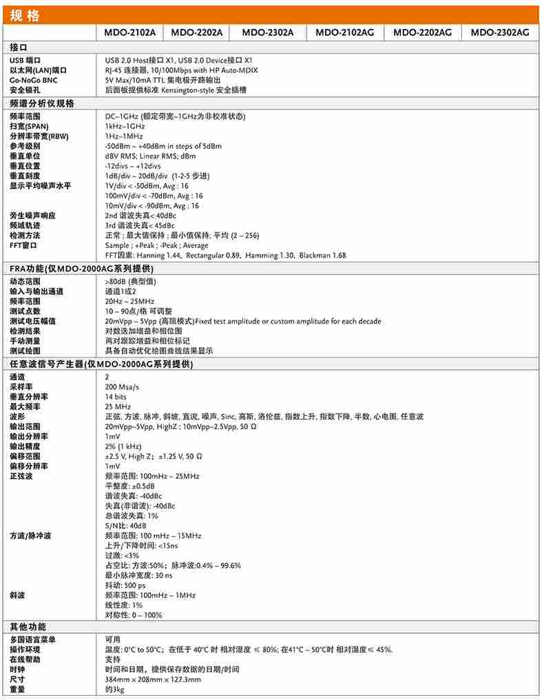 MDO-2000A系列是一款多功能混合域数字示波器。全机种带宽范围包括300MHz,200MHz和100MHz。实时采样率2GSa / s,储存深度20M /每通道。 该系列包括MDO-2000A和MDO-2000AG两个机种,全系标配频谱分析仪的功能。重要的是,MDO-2000AG具有一个双信道25MHz任意波信号发生器,并提供频率响应分析(FR