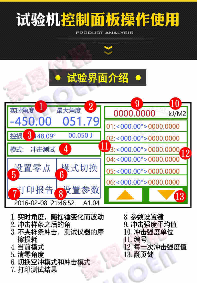6. IZOD冲击试验机可选择中英文操作界面,测试结果可选择J/m,KJ/㎡,kg-cm/cm,ft-ib/in等单位