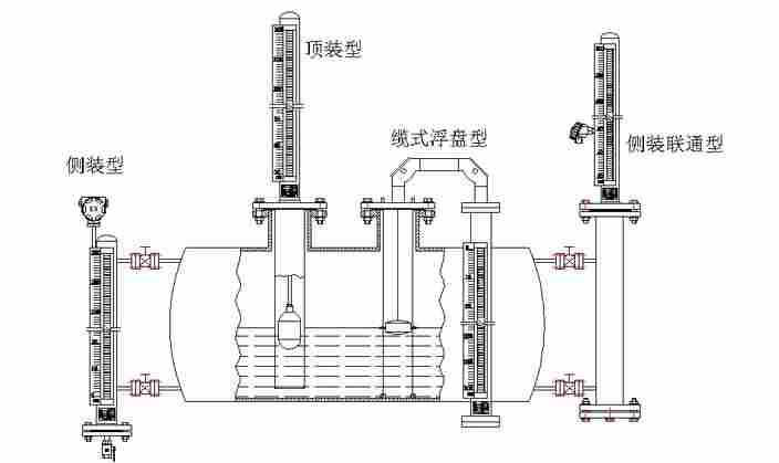测量液体时采用顶装或旁通管侧装方式。磁翻柱主体外加装翻柱液位指示器、液位开关及液位变送器。磁单元置于浮球内部或通过顶杆与浮球相连,当浮球连带磁单 元随液位变化时,使磁性色块(磁翻板)翻转;磁性液位开关在对应液位点动作;同时液位传感器在浮球磁力的作用下,输出标准的变化电阻信号,再经过变送器把电阻信号转换 成4~20mA电流信号输出。