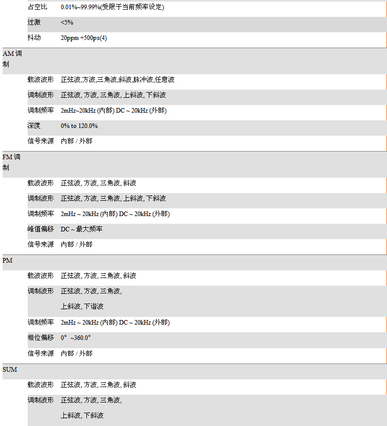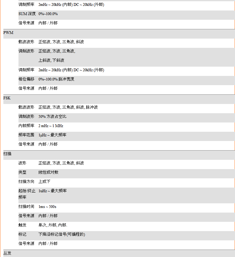 • 多种调变功能:AM、FM、PM、ASK、FSK、PSK、SUM和PWM