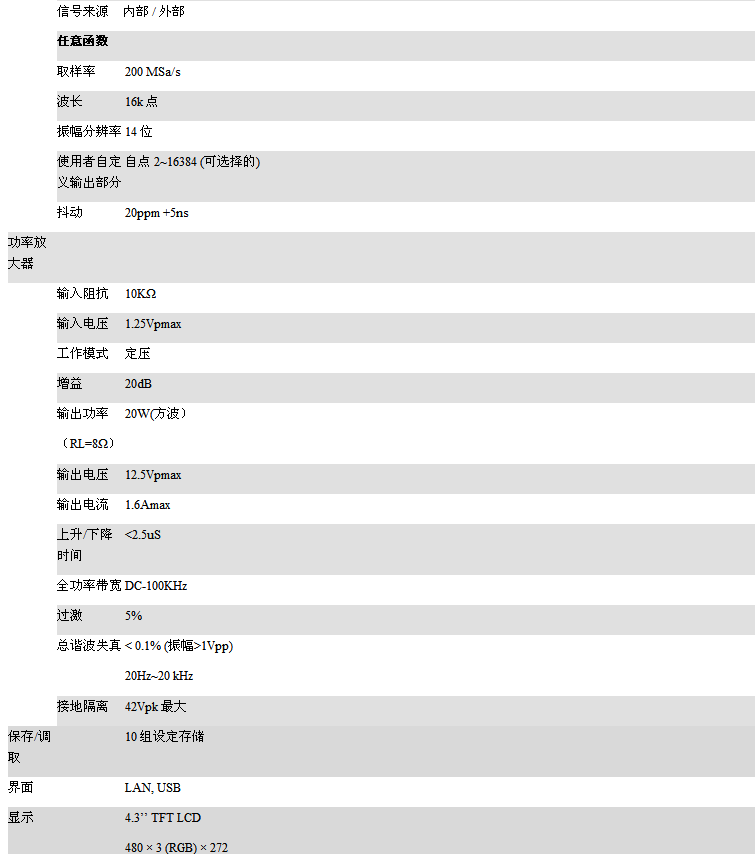 • ”真实逐点输出”的任意波功能,取样率高达200MSa/s,100MHz波形重复率,分辨率14位,内存长度16k点